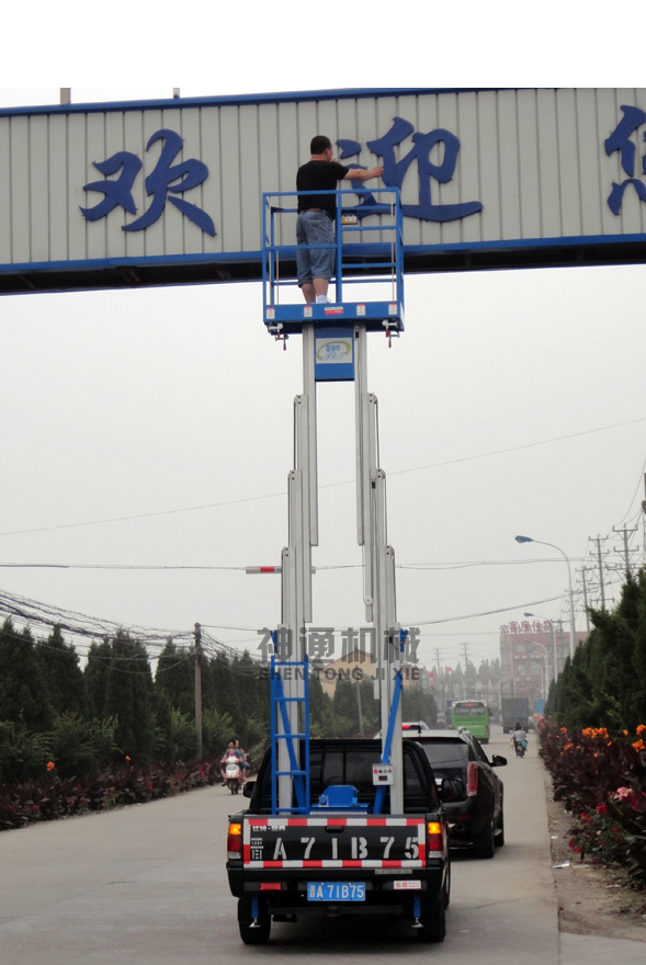 產(chǎn)品規(guī)格:車載鋁合金式升降平臺根據(jù)升降高度可分為:單柱68、10米,雙柱6、8、10、12米升降平臺,設(shè)備載重150公斤至200公斤??蛻艨筛鶕?jù)需求選用解放、東風(fēng)、輕騎、福田、電瓶車等任何車型,設(shè)備直接采用汽車或電瓶的直接動力升降。